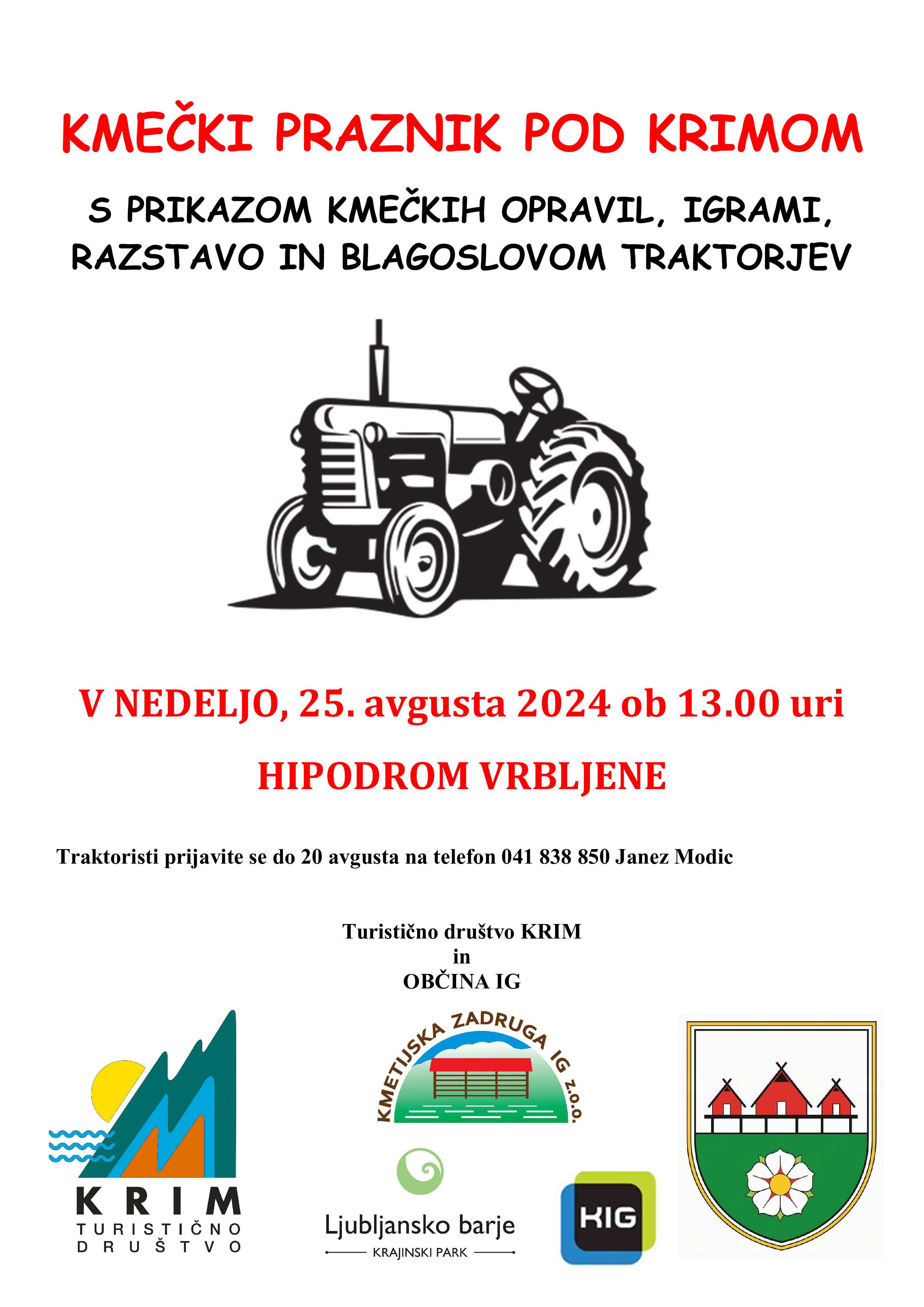 Zaradi organizacije blagoslova traktorjev prosimo, da se vsi zainteresirani prijavijo do 20. 8. 2024, na tel. 041 838 850 – Janez Modic.